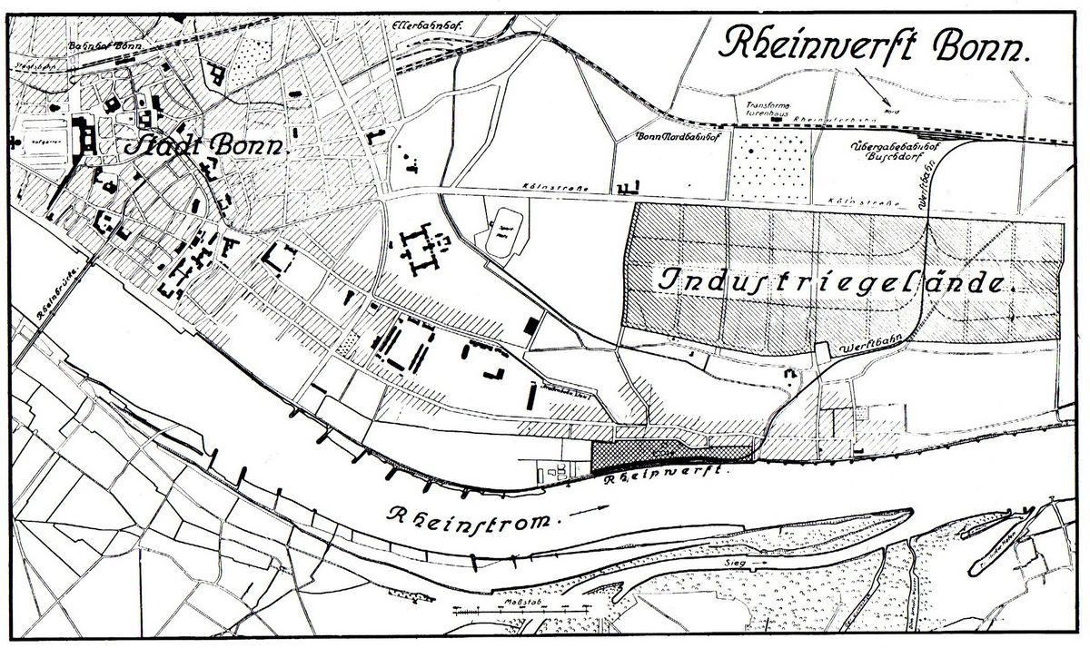 Der Erste Weltkrieg und die frühen Jahre der Weimarer Republik hatten für Bonn schwerwiegende wirtschaftliche Folgen. Infolge der katastrophalen Inflation waren viele ursprünglich vermögende Familien verarmt, deren Steueraufkommen der Stadt jetzt fehlte. Die Ansiedlung von Industrie sollte da Abhilfe schaffen. Was heute Auerberg darstellt, gedachte man nach einem Plan von 1924 komplett als Industriegelände zu nutzen, von der Josefshöhe bis zum Engländerweg! 1924 war ebenso der Rheindorfer Hafen als Nachfolger kleiner Vorgänger vor der Stdtmauer fertiggestellt und mit einer eigenen „Werftbahn“ mit der Rheinuferbahn und dem Verschiebebahnhof Buschdorf (1974 eingestellt) verbunden worden. (Die Trasse ist als Graben neben der Saarbrückener Straße und gern genutzter Radweg bis zum heutigen Rheindorfer Hafen noch vorhanden.)