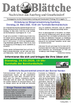 Themen u.a.: Einladung zur Bürgerversammlung | 70 Jahre Ortsausschuss Auerberg | Beteiligungswerkstatt zum Landschaftsraum zwischen Auerberg, Graurheindorf und Hersel | Interview mit der Schulleiterin der Bernhardschule | Stadtteilgärtchen Kopenhagener Straße | 20 Jahre Seniorenheim Josefshöhe | 7 MB